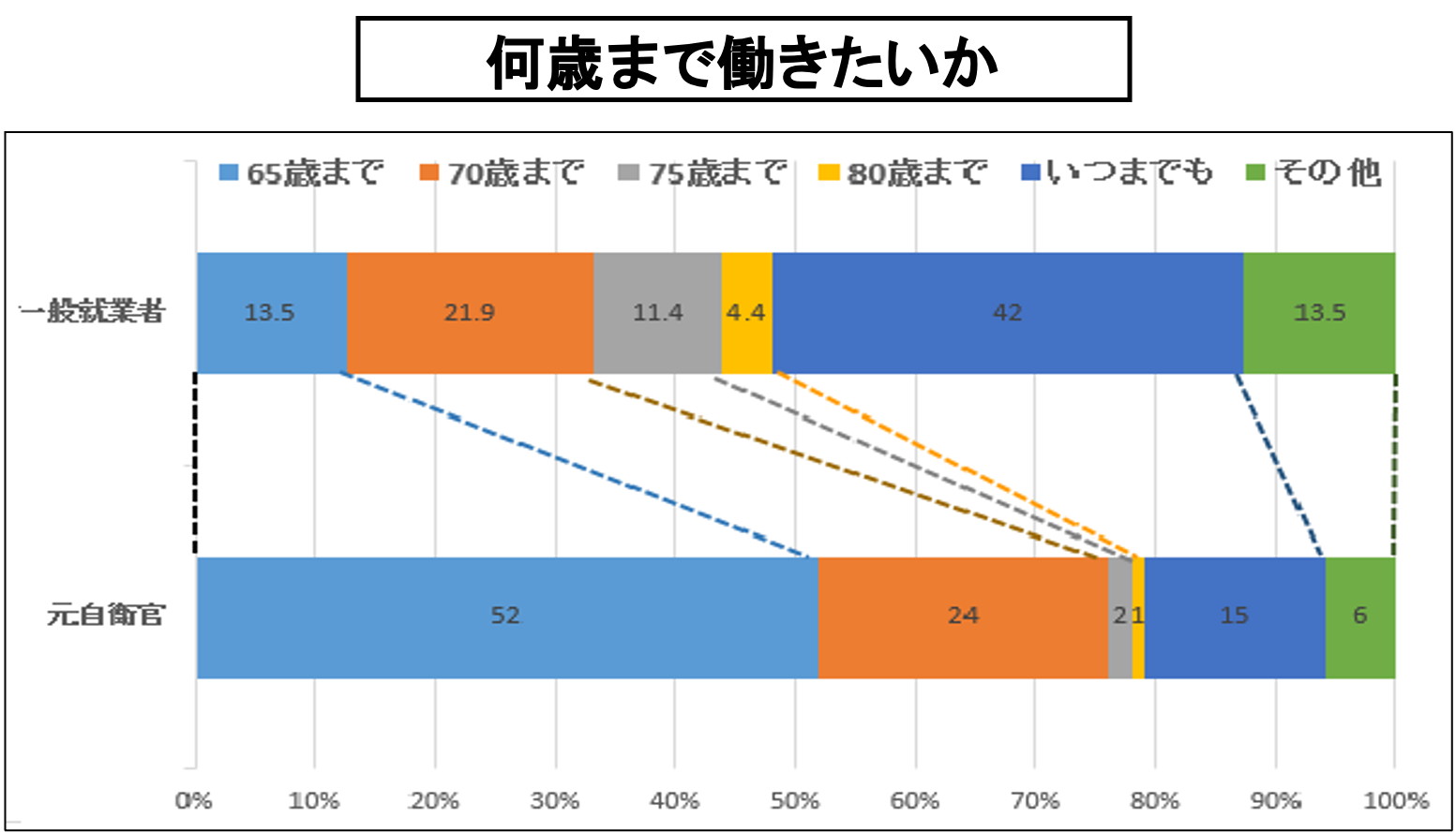 表は、一般の就業者と退職後2、3年後の元自衛官の「何歳まで働きたいか」の意識調査を比較したものである。